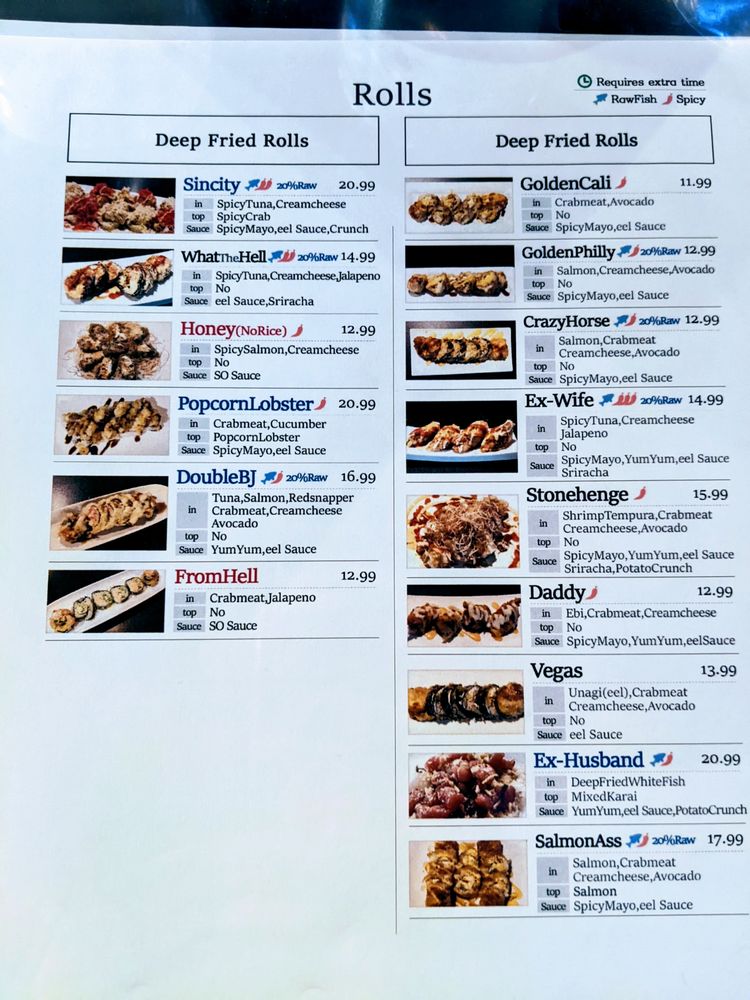 In : Spicy Tuna Spicy Salmon, JalapenoTop : NoSauce : YumYum, eel Sauce, Potato Crunch