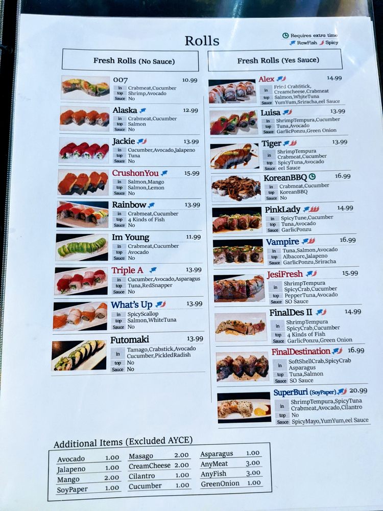 In : Spicy Tuna, Crabmeat, CreamCheeseTop : NoSauce : YumYum, Extra Spicy Sauce