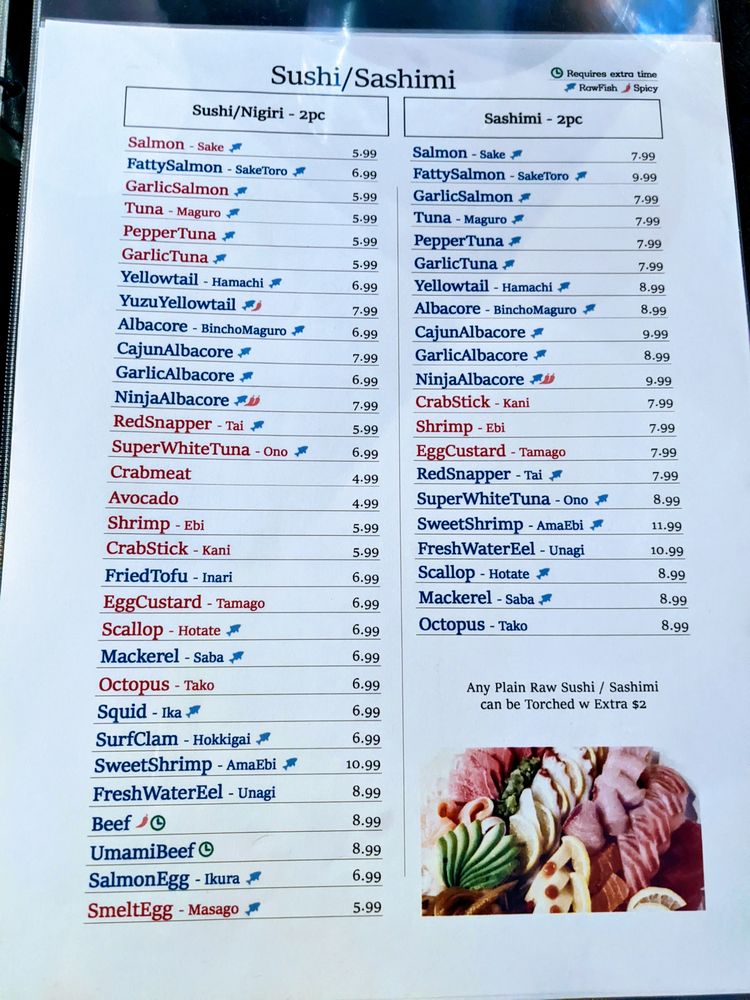 In: shrimp tempura, cream cheese. Top: spicy tuna, tuna, white tuna.Sauce: Extra spicy sauce, yumyum.