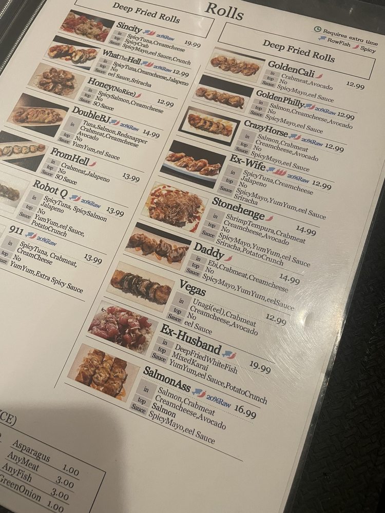 In: spicy tuna, cream cheese Top: spicy crabSauce: eel, spicy mayo, crunch.